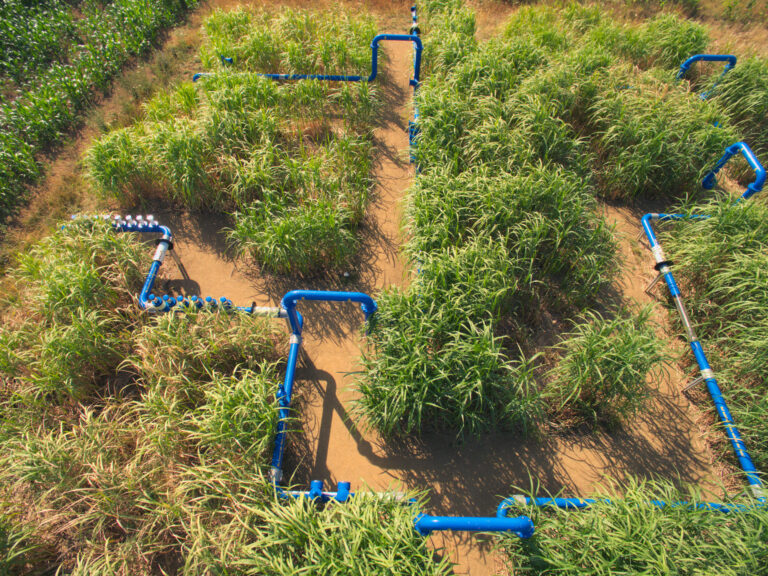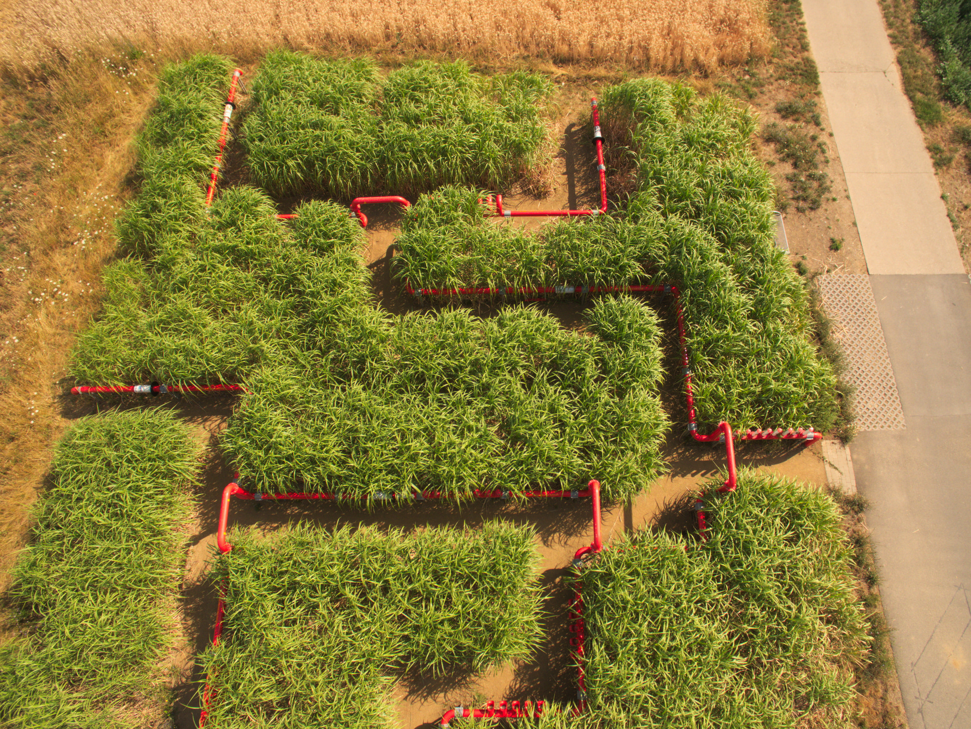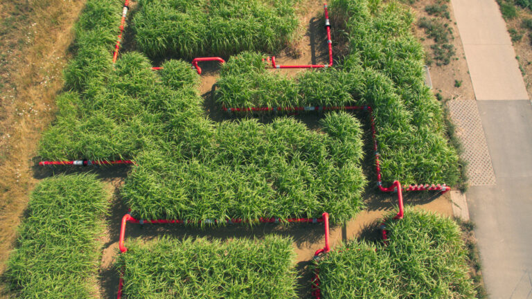 Die Agrar-Kultur-Achse zeigt am Beispiel der Maispflanze, wie komplex moderne landwirtschaftliche Produktion und Verarbeitung sind. Ein blaues Rohrsystem veranschaulicht die Schritte des Anbaus auf dem Feld, während ein rotes Rohrsystem die vielfältigen Nutzungsmöglichkeiten nach der Ernte darstellt. So werden Arbeitsprozesse und Wertschöpfungsketten sichtbar, die sonst meist im Verborgenen bleiben.