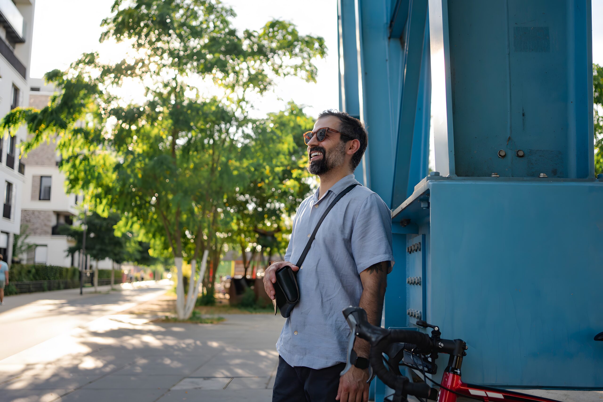 Abends wird das Bauwerk durch eine inszenierte Beleuchtung hervorgehoben, die die Konturen von Aufbau, Kanzel und Ausleger betont. Der Blaue Kran liegt direkt am Mainradweg und an der Regionalpark Rundroute und ist damit ein attraktiver Zwischenstopp für Radfahrende und Spaziergänger, die den Ausblick über Main, Hafenbecken und die Skyline von Frankfurt genießen möchten.