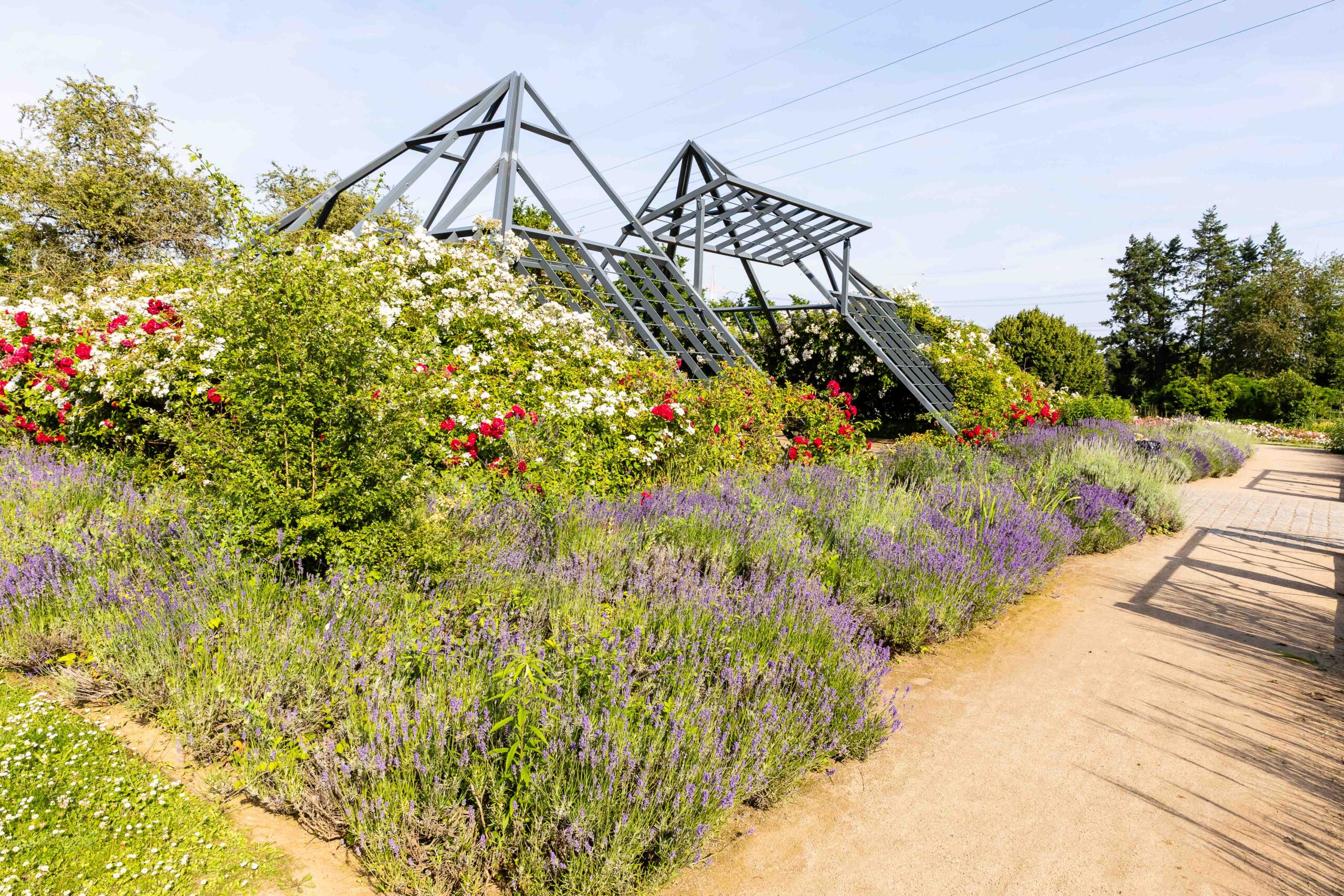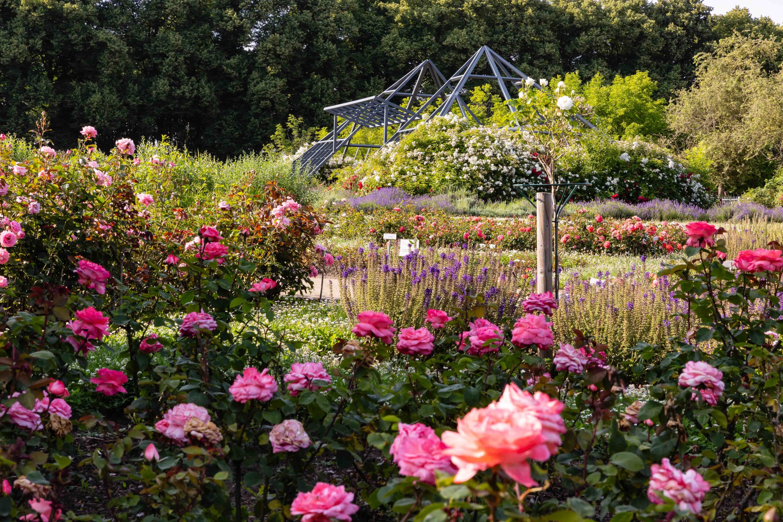 Heute blühen hier auf 10.000 m² von Mai bis in den Herbst über 6.500 Rosen in mehr als 130 Sorten. Das unübersehbare Highlight sind die Rosenpyramiden, die von duftenden Kletterrosen eindrucksvoll überwachsen sind. Ein Paradies für Rosenliebhaber – und für alle, die sich inspirieren lassen möchten.
