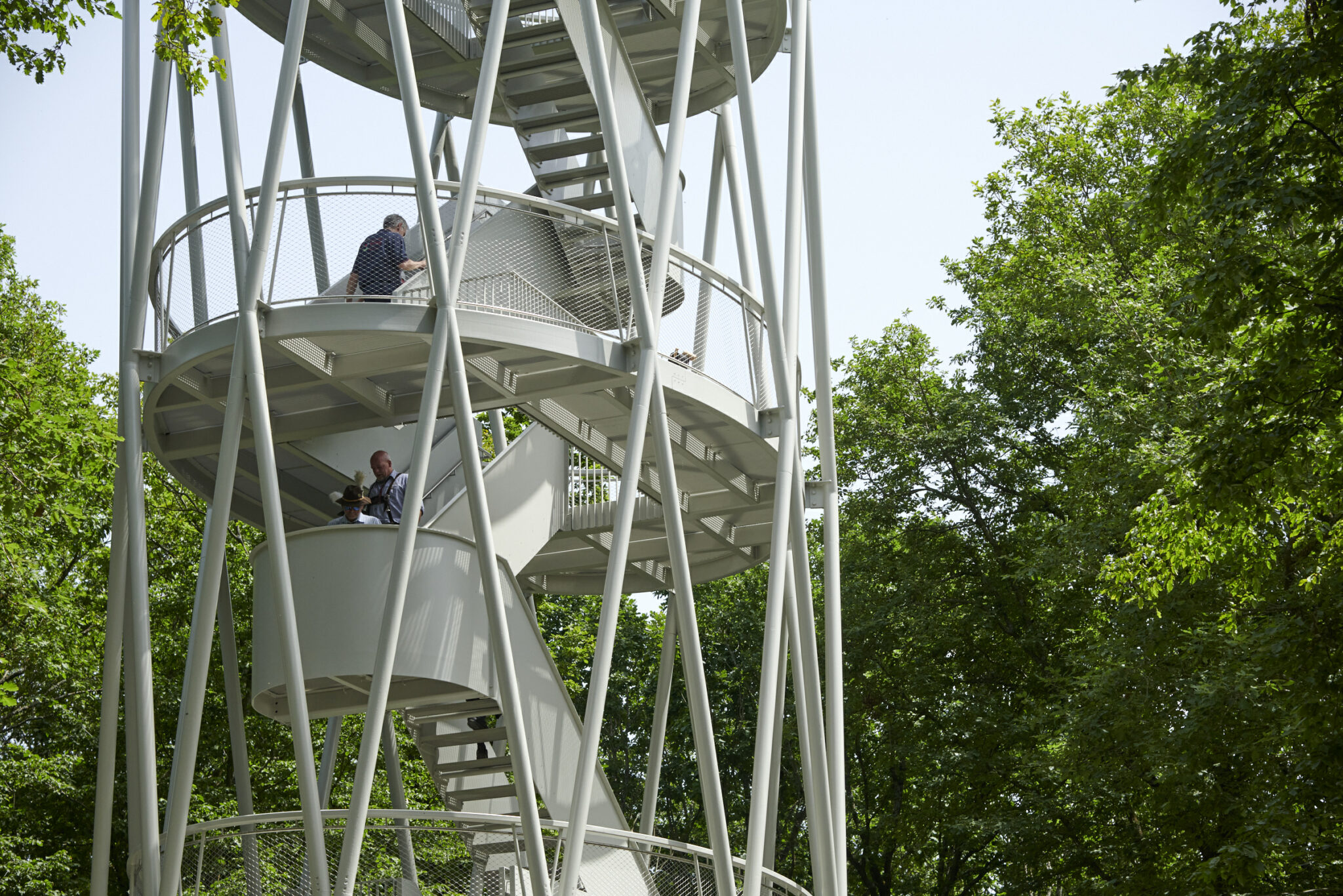 Rund 140 Stufen führen hinauf zur Aussichtsplattform in fast 27 Metern Höhe über dem Boden. Unterwegs laden mehrere Ebenen dazu ein, innezuhalten und die Umgebung aus unterschiedlichen Höhen zu betrachten. Die offene Stahlkonstruktion, die sich je nach Licht mit dem Himmel verbindet oder deutlich vom Wald abhebt, macht den Aufstieg zu einem besonderen Raumerlebnis.