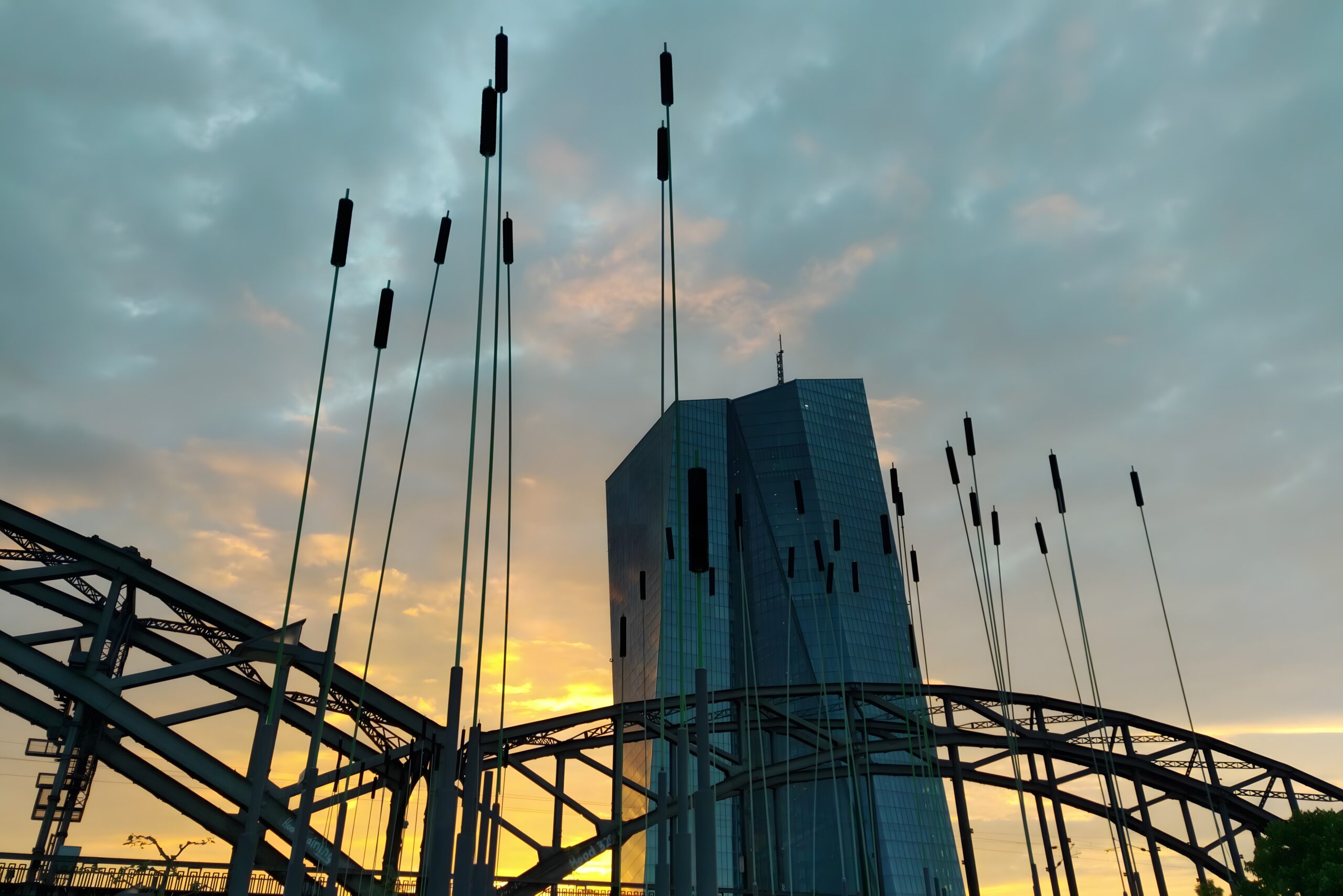 Die Station „Flusswind“ der Klimaroute liegt im Frankfurter Hafenpark am nördlichen Mainufer. Hier treffen Flusswind, Verdunstungskühle des Wassers und die Kaltluft des Parks aufeinander und sorgen dafür, dass es spürbar frischer ist als in den dicht bebauten Quartieren der Innenstadt. Die Installation aus hohen, biegsamen Windhalmen macht die Luftbewegungen sichtbar und lädt dazu ein, die Bedeutung von Frischluftschneisen für das Stadtklima zu entdecken.