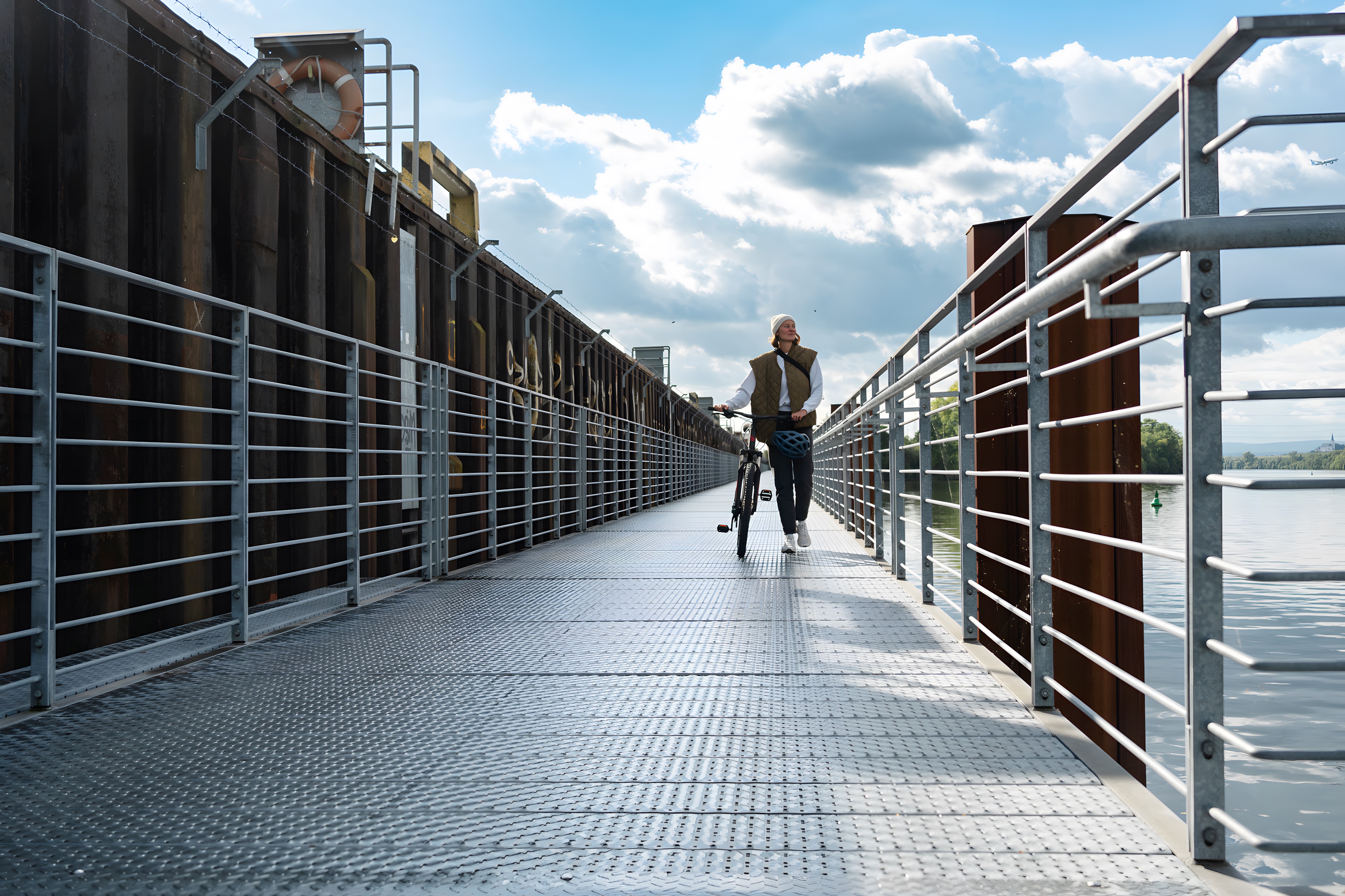 Die Ölhafenbrücke Raunheim verbindet das südliche Mainufer mit dem Raunheimer Ölhafen und ist zu einem markanten Wahrzeichen für Radfahrer und Fußgänger geworden. Die weiße Stahlkonstruktion mit ihrem charakteristischen Rondell bietet eindrucksvolle Perspektiven auf den Fluss, den Hafen und die umliegende Industrie- und Flusslandschaft.