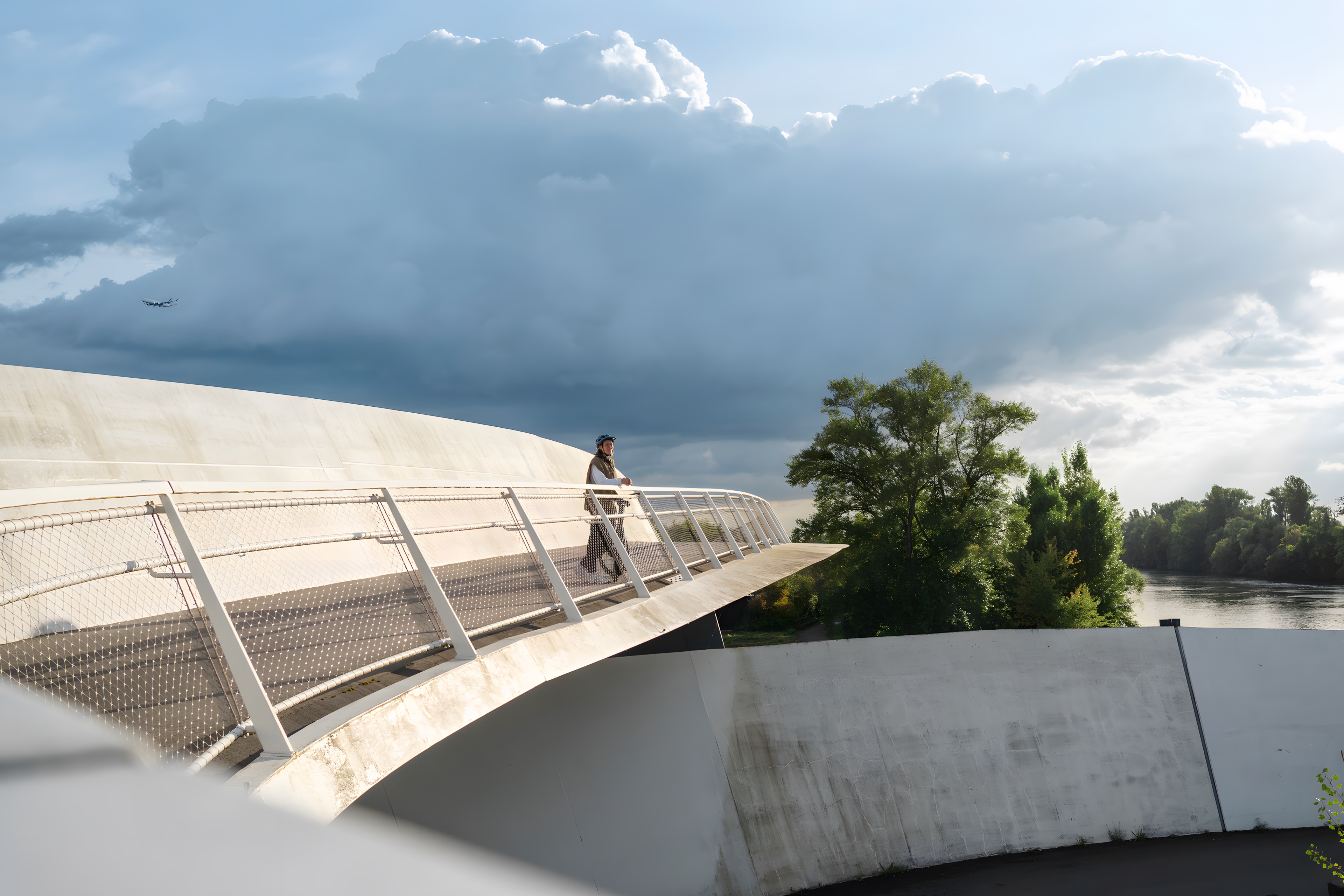 Die 2013 fertiggestellte Ölhafenbrücke ist als frei tragende Stahlkonstruktion konzipiert, die sich in einem leichten Schwung über die Zufahrt des Raunheimer Ölhafens spannt. Mit einer Stützweite von rund siebzig Metern wirkt die Brücke trotz ihrer massiven Bauweise filigran und leicht. Das große Rondell auf der Westseite nimmt die Form der benachbarten Tankbehälter auf und schafft einen großzügigen Aufenthaltsbereich mit weitem Blick über den Main.