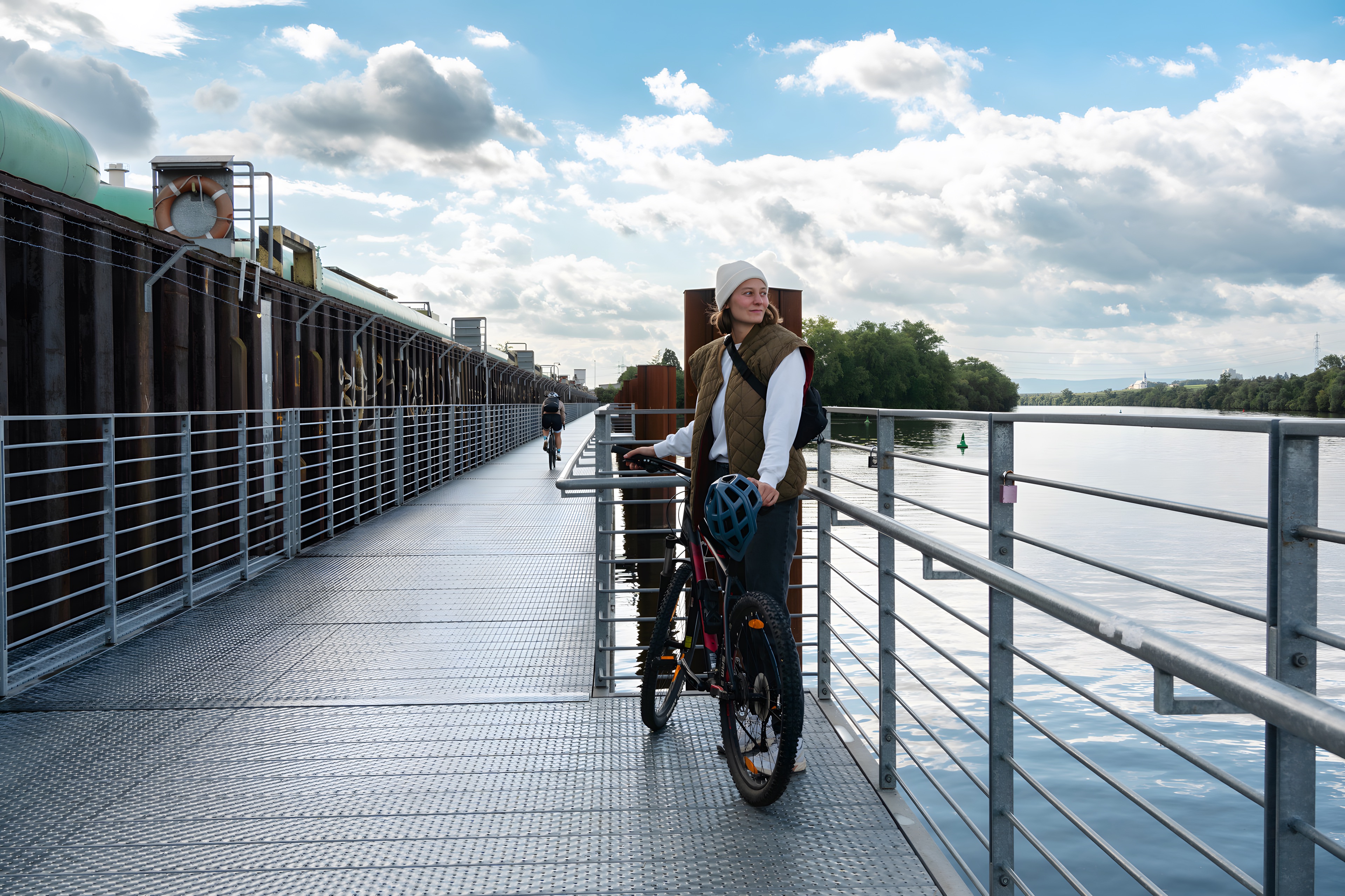Sanft ansteigende Rampen erleichtern den Zugang für Radfahrende, Fußgänger, Kinderwagen und mobilitätseingeschränkte Personen. Das Rondell dient als Aufenthalts- und Aussichtspunkt, an dem sich Besucherinnen und Besucher kurz ausruhen und den Blick über den Fluss schweifen lassen können. Durch ihre Gestaltung und Lage hat sich die Brücke zu einem beliebten Fotomotiv und zu einem markanten Erlebnisort am Main entwickelt.