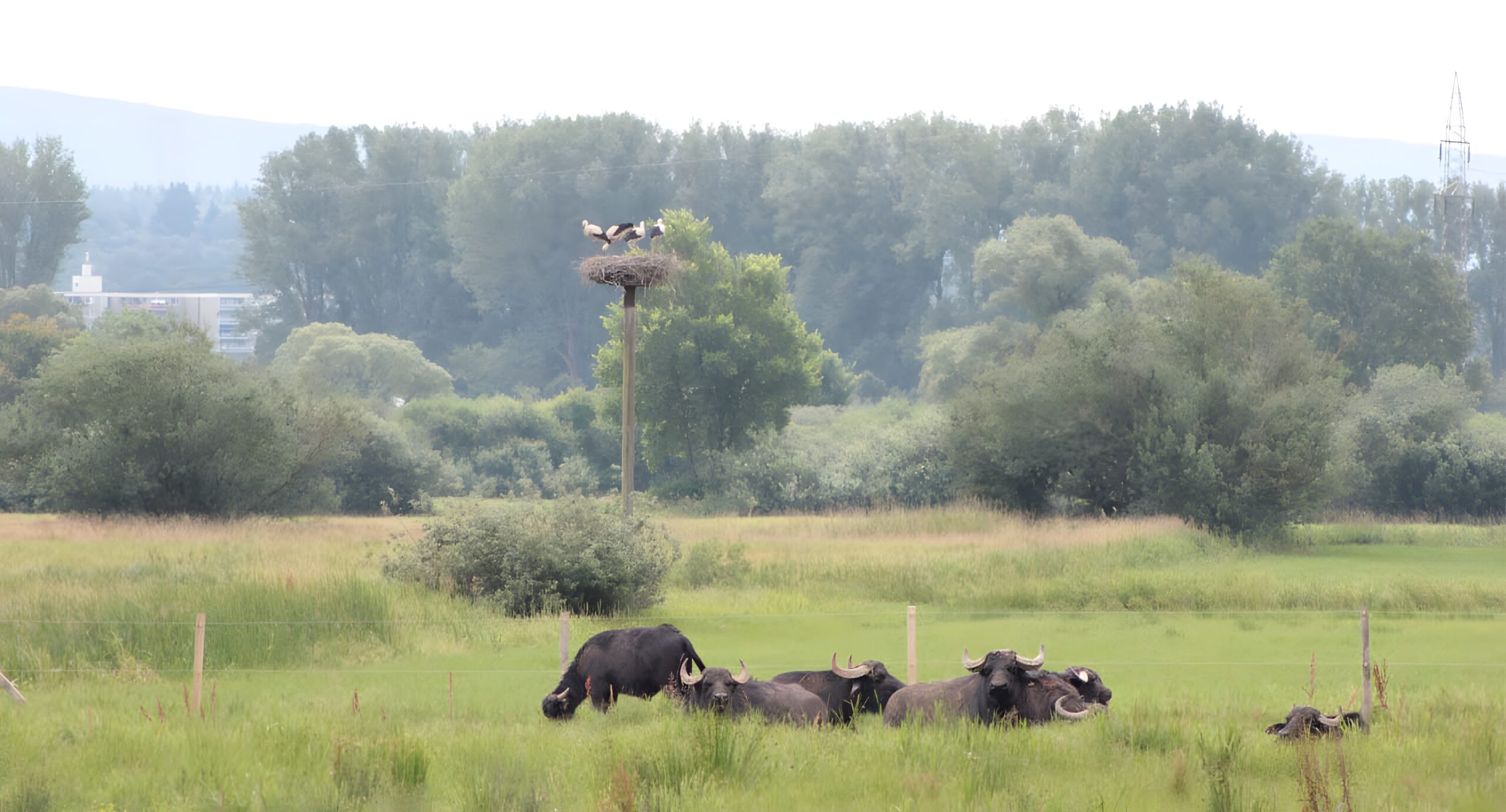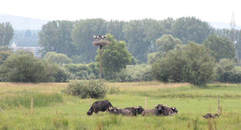 Wasserbüffel im Naturschutzgebiet Weideswiesen bei Erlensee: naturnahe Beweidung, Artenvielfalt und Aussichtsplattform in den Kinzigauen des Main-Kinzig-Kreises.