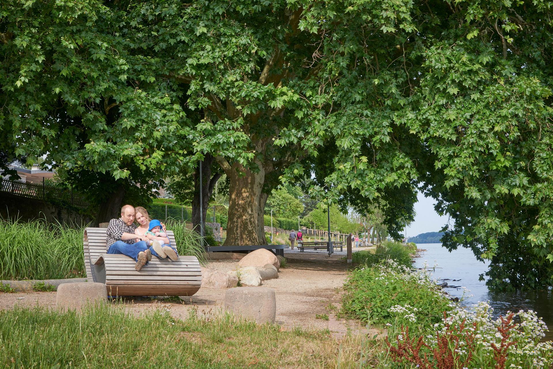 Der Aussichtspunkt Lachaue in Geisenheim ist ein gestalteter Platz am Rheinufer mit Cortenstahl-Silhouetten, Holzliegeflächen und weitem Blick über den Rhein und die Auenlandschaft.