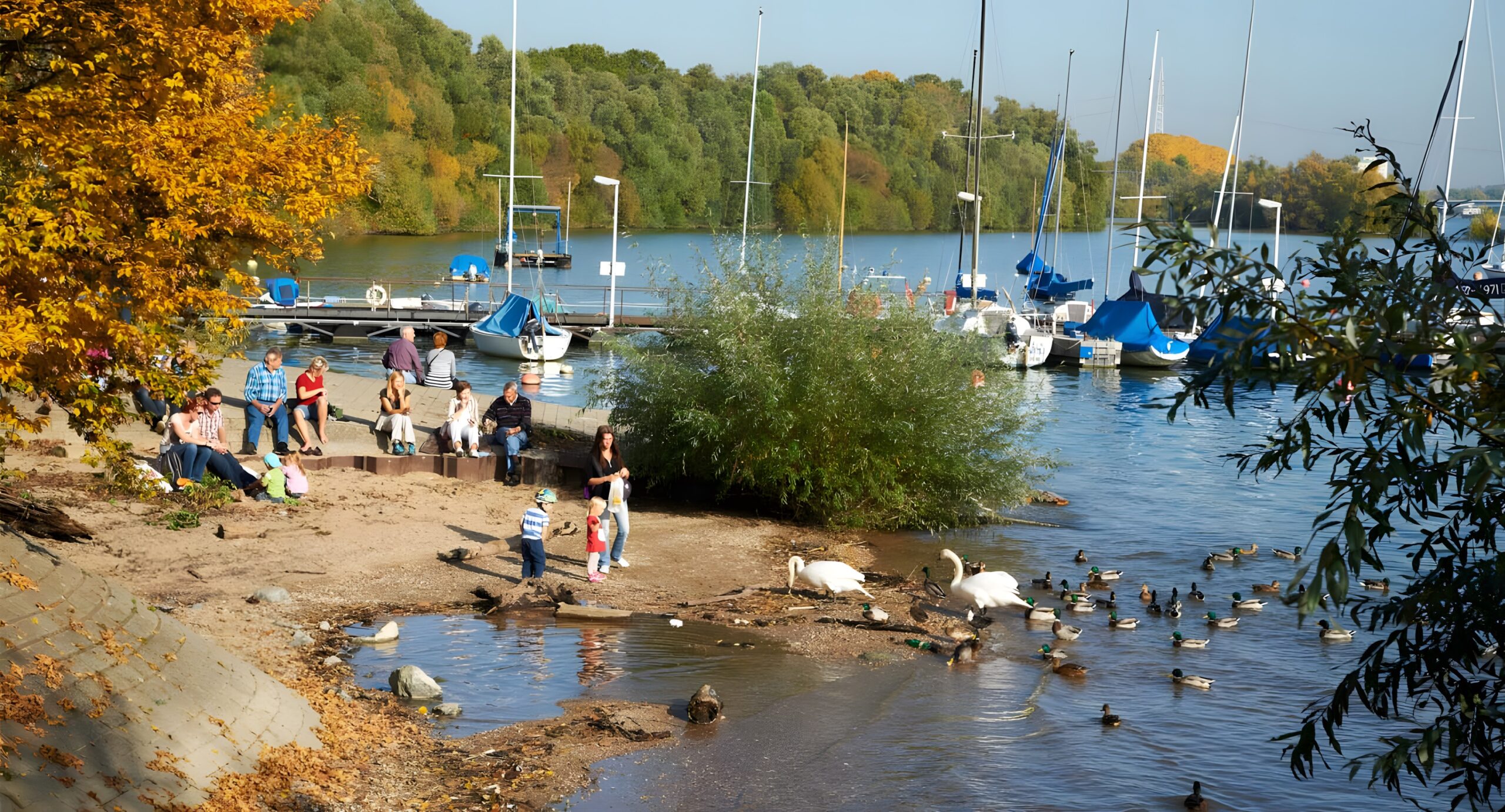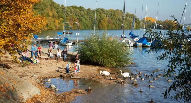 Rast- und Aufenthaltsplatz direkt am Wallufer Rheinufer mit barrierefreier Aussichtsplattform, Sitzstufen und Übergang ins angrenzende Naturschutzgebiet an der Regionalparkroute Leinpfad.