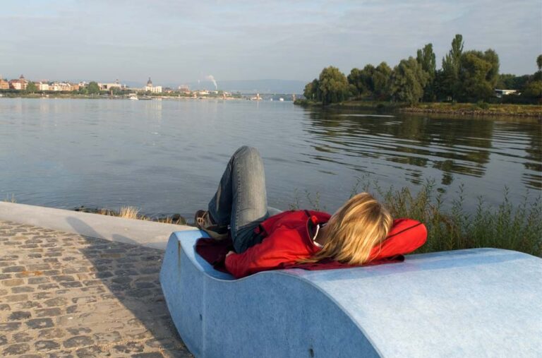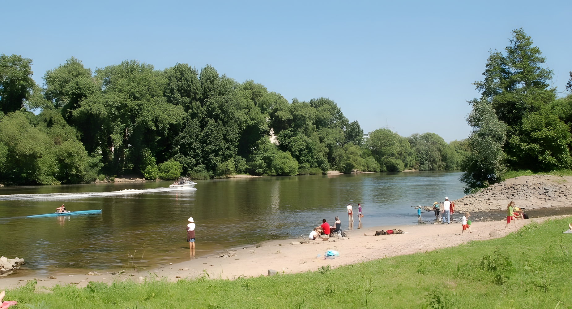 Die Wiesenterrassen Karben an der Nidda sind ein Erlebnispunkt der Regionalpark Niddaroute mit Holzdecks, Boulebahn und Einblicken in die Flussrenaturierung.
