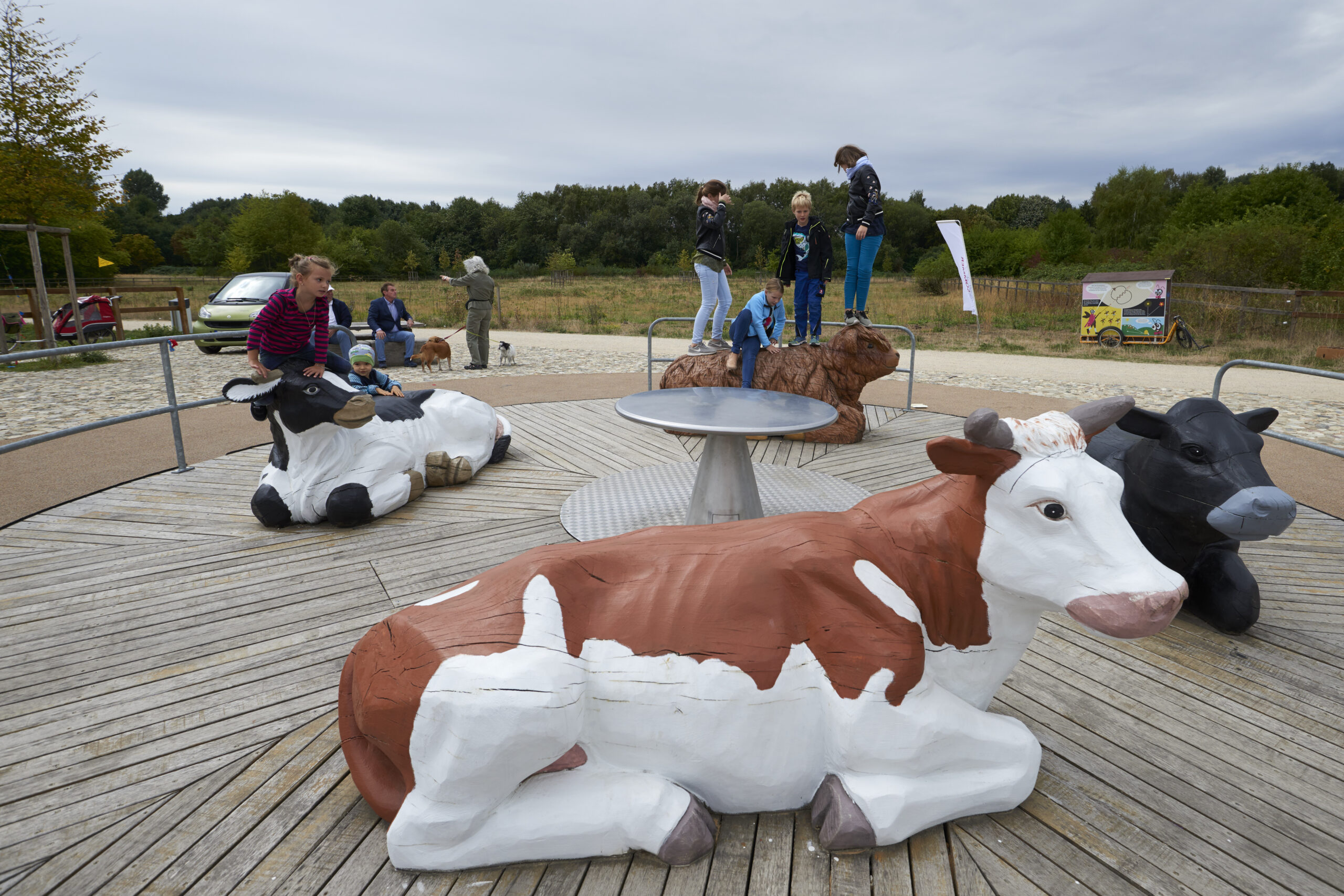 Im Zentrum der Rinderwiesen steht das Rinderkarussell als künstlerisch gestalteter Aufenthaltsbereich. Auf einer Drehscheibe gruppieren sich aus Holz geschnitzte Rinderskulpturen, die von den echten Rindern auf den umliegenden Weiden umgeben sind. Sitz- und Aufenthaltsflächen laden zum Verweilen ein, während die offene Topografie weite Ausblicke ermöglicht. Der Ort ist zu Fuß und mit dem Rad erreichbar und eignet sich als Zwischenstopp auf Wegen rund um das Arboretum.