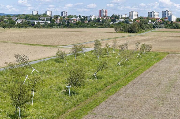 Die Rinderwiesen mit Rinderkarussell bei Schwalbach am Taunus sind eine naturnahe Weidelandschaft am Arboretum Main-Taunus mit Kunstwerk, Rindern und weitem Blick auf Taunus und Frankfurter Skyline.