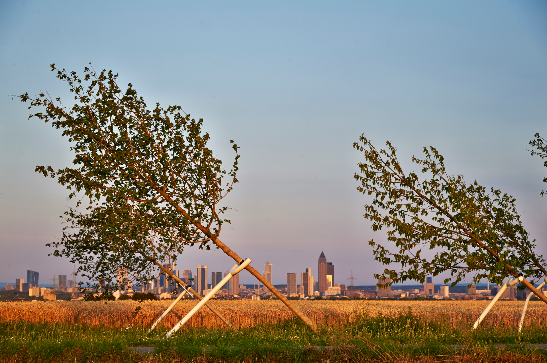 Das ungewöhnliche Kunstwerk erinnert an eine Schlacht bei Eschborn, die im Jahr 1389 dort auf der Gemarkung „Streitplacken“ stattgefunden hat. Der Waffenstreit ging aus einer Fehde zwischen den Kronberger Rittern und den Bürgern der freien Reichsstadt Frankfurt hervor. Obwohl zahlenmäßig überlegen, waren am Ende des Konflikts die Städter den kampferprobten Rittern unterlegen. Es war ein Kampf um Einfluss in der Region, zwischen Stadt und Land, Zunftsystem und Feudalherrschaft, Handelsfreiheit und Zollschranken. Die Künstler Ulrich Genth und Heike Mutter nahmen 2014 den historischen Konflikt zum Anlass für ein landschaftliches Bild. 26 Bäumen wurden in Schieflage gepflanzt und durch Stützen, die zugleich als Zwingen fungieren, in Position gehalten. Im Laufe der Zeit werden die Bäume auf ihre Schieflage reagieren. In ihrer Deformation werden die Bäume auf ihre Schieflage reagieren. In ihrer Deformation werden die Bäume zum Gegenstand der Reflexion über Vergangenes und Gegenwärtiges, in ihrem weiteren Wachstum zum Licht aber zugleich ein Symbol für Überwindung und Veränderung.