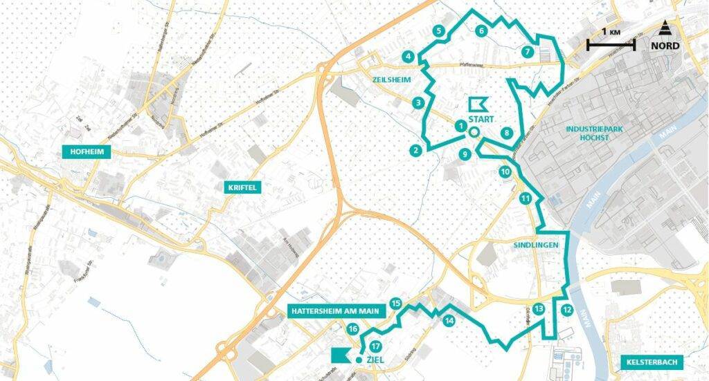 Was hinter großen Infrastrukturen wie Flughäfen, Gleisfeldern und Industriekomplexen liegt, führt oft im wahrsten Sinne des Wortes ein Schattendasein. Im Falle der Höchst-Werke heißen die Orte „dahinter“ Zeilsheim und Sindlingen. Mit etwas Abstand zur Werksmauer folgt dann Hattersheim, das seinerseits etwas verloren in der Ebene zwischen Mainufer und Taunushang liegt. Die Tour erkundet diese „Aschenputtel“ der Region. Wer ihrer Route folgt, entdeckt erstaunliche Kleinode des Siedlungsbaus, in Vergessenheit geratene Weltgeschichte, einen beständigen Wechsel von Bebauung und offener Landschaft, einen der spannungsreichsten Abschnitte des Mainufers und einige architektonische Landmarken.