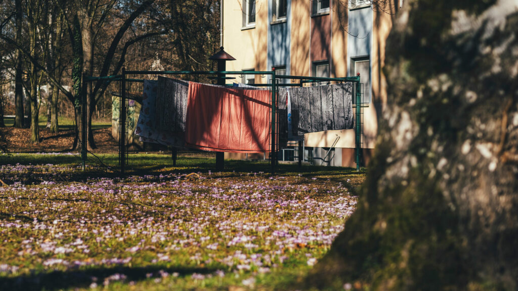 Jenseits der Grabeländer beginnt die letzte Etappe dieser Tour. Zwischen langen Reihen Spalierobst gehe ich auf das mächtige Hochhaus des Hattersheimer Südring zu. Das 19-geschossige Wohnhaus in der Form eines rechten Winkels stellt den südwestlichen Abschluss der Siedlung Südring dar und ist eine der Landmarken der Region. Erst als ich dicht davorstehe, sehe ich den Durchgang, der mich mich auf die Innenseite des Gebäudewinkels führt. Ich überquere den Parkplatz (dessen Umrisse in etwa den Schattenwurf des Hauses nachzeichnen) und den Südring und biege dann links in einen langen Garagenhof ein, an dessen Ende mich eine kleine Treppe hinter der letzten Garage auf das erwartete Siedlungsgrün bringt. Über die Zugangswege zu den Zeilenbauten gelange ich schließlich in die Einfahrt des