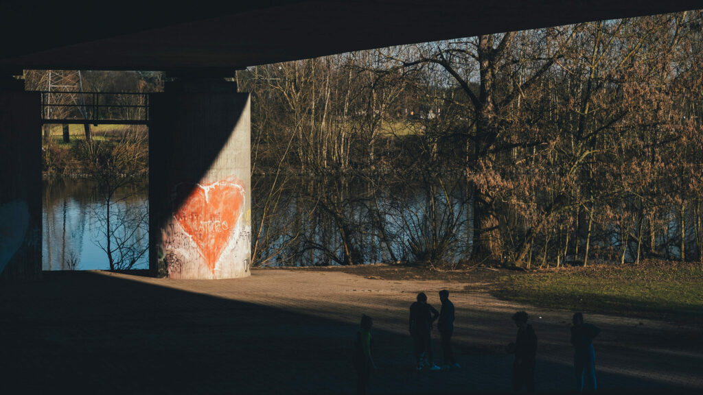 Der riesige Raum „under the bridge“ ist erstaunlich „aufgeräumt“. Sind die Obdachlosen etwa auch im Lockdown? Die kleine Diensttreppe der Autobahnarbeiter führt mich auf den Deichweg, der nach einigen Metern abbricht, woraufhin rechterhand ein Pfad abwärts ins Unterholz führt. Als ich aus dem Dickicht auftauche, stehe ich vor einem Stellplatz für Schausteller-Wohnmobile und ausgediente Imbissbuden. Ein minimaler Fäulnisgeruch liegt in der Luft. Eine schmale, staubige und von einer Leitplanke begleitete Straße führt mich abermals durch ein ausgedehntes Areal von Grabeländern bis vor das Tor des Sindlinger Klärwerks mit seinem futuristischen, von drei Piloti durchstoßenen, dreieckigen Betriebsgebäude.
