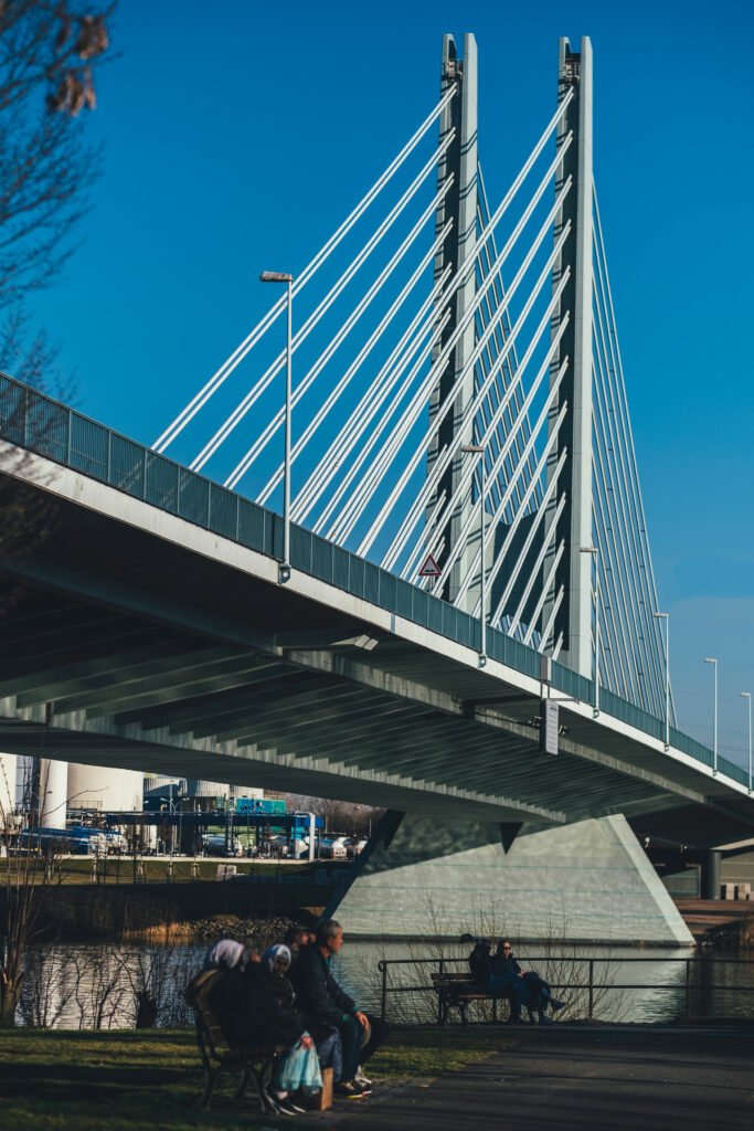 gelange ich ins Dorf. Verwinkelte Gassen führen mich hinunter an den Main. Über dem Fachwerk der Zehnthofgasse thront die Stahlseilharfe der Werksbrücke West, die die Werksteile dies- und jenseits des Mains verbindet und deren eine Fahrbahn auch der Öffentlichkeit als Fuß- und Radweg zur Verfügung steht. Auf ihr war ich am Vortag vier jungen Männern begegnet, die auf Campingstühlen an der Werksmauer hockten und chillten. Warum sie denn nicht unten am Fluss säßen, hatte ich gefragt. „Weil es da kälter ist als hier“ bekam ich zur Antwort. Ich fuhr ein paar Meter auf die Brücke und war hingerissen vom Panorama über das Werksgelände und den Fluss. Auf dem Rückweg gab ich der Gruppe meine Begeisterung zum Ausdruck. „Ja, das ist schon ne Stadt für sich. Wollen sie nach Frankfurt? Da müssen Sie gaaanz außen rum fahren. Das zieht sich…“