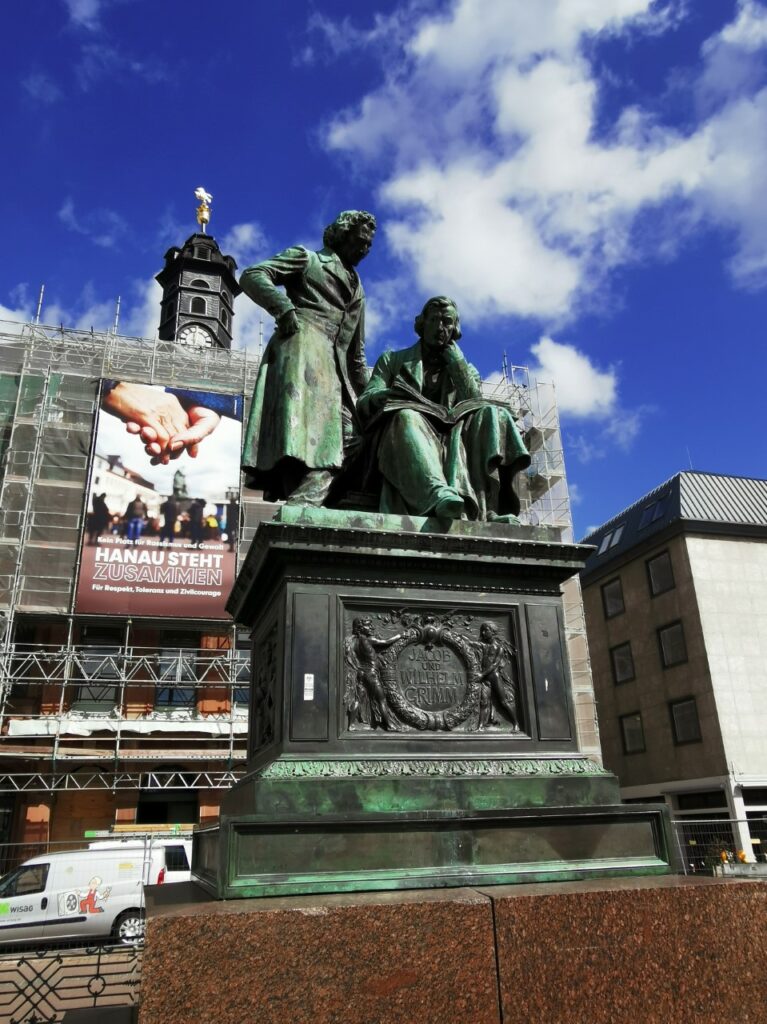 Die Unterführung am Kanaltorplatz ist gesäumt von Skulpturen, Wandbemalungen und Denkmälern, darunter die Gedenktafel für einen Abwasserkanal. Die Dichte von Gedenkorten in dieser Stadt ist bemerkenswert. So begleiten mich – neben den omnipräsenten Gebrüdern Grimm und ihren Märchenfiguren – schon den ganzen Tag gesprühte und geklebte Portraits der Opfer des rassistischen Anschlags vom 19. Februar 2020 und der Gedanke, dass es schon fast eine Ironie des Schicksals ist, dass der Täter – der seine Opfer gerade nicht als Persönlichkeiten, sondern als anonyme Vertreter einer ihm verhassten Gruppe betrachtete – ausgerechnet in einer so gedenkengeübten Stadt wie Hanau zuschlug, kommt mir in den Kopf.
