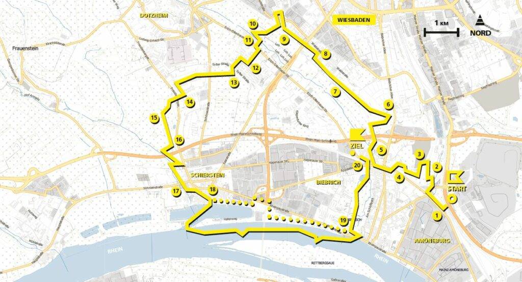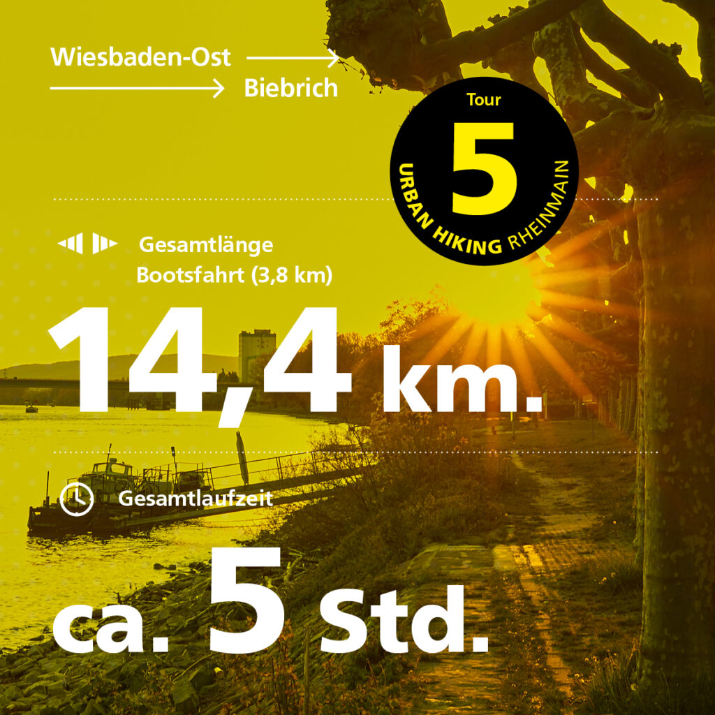 Wiesbadens Lage ist widersprüchlich: Die Stadt liegt am Rhein und auch wieder nicht, sie liegt gegenüber von Mainz und auch wieder nicht, sie ist keine Industriestadt, aber eigentlich doch. Die Tour startet im Niemandsland auf ehemaligem Mainzer Stadtgebiet, führt dann durch die „Kontaktzone“ zwischen rheinischer Dörflichkeit und mondänem Kurort, um schließlich die Ausläufer der Wiesbadener Kernstadt zu berühren. Von da aus wendet sie sich wieder dem Rheintal zu und führt zwischen Weinbergen und Siedlungen hinunter nach Schierstein, um mit einer Schifffahrt über die Rettbergsaue zum Biebricher Schloss zu enden. Es ist eine echte Tour de Force.