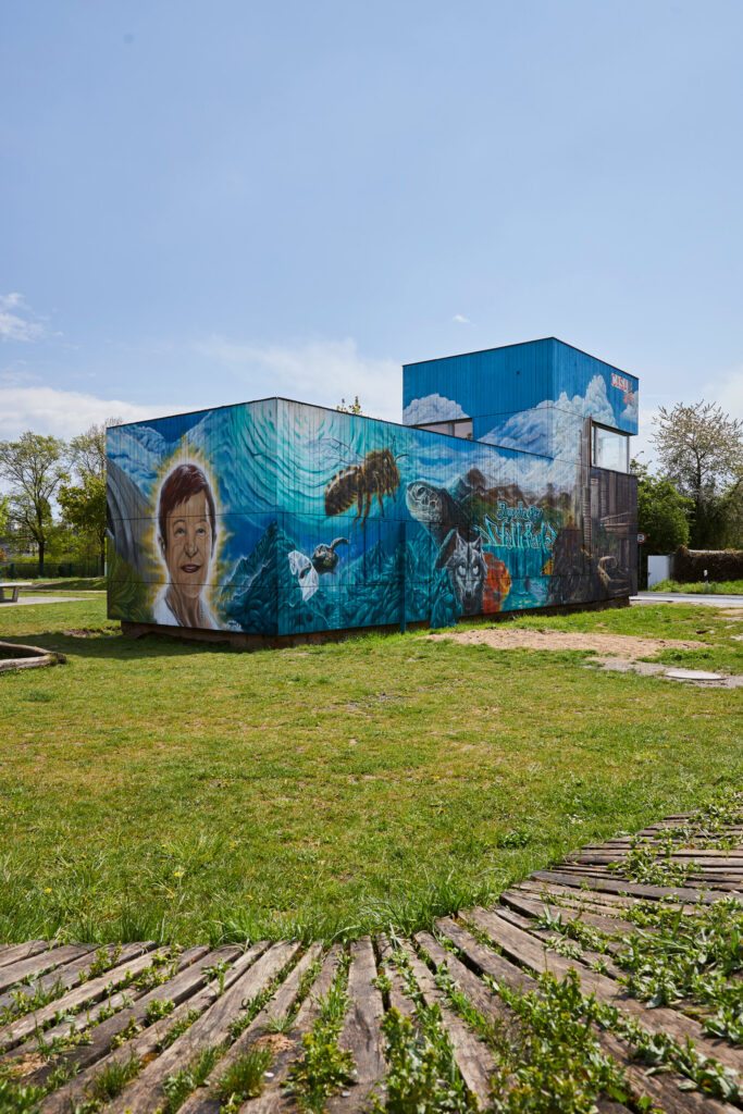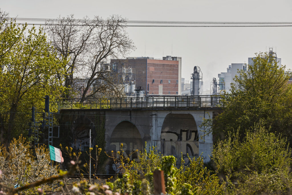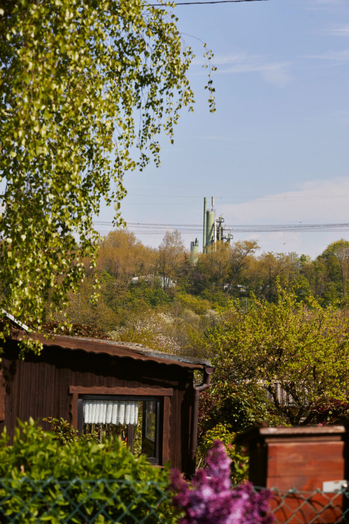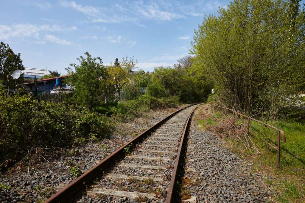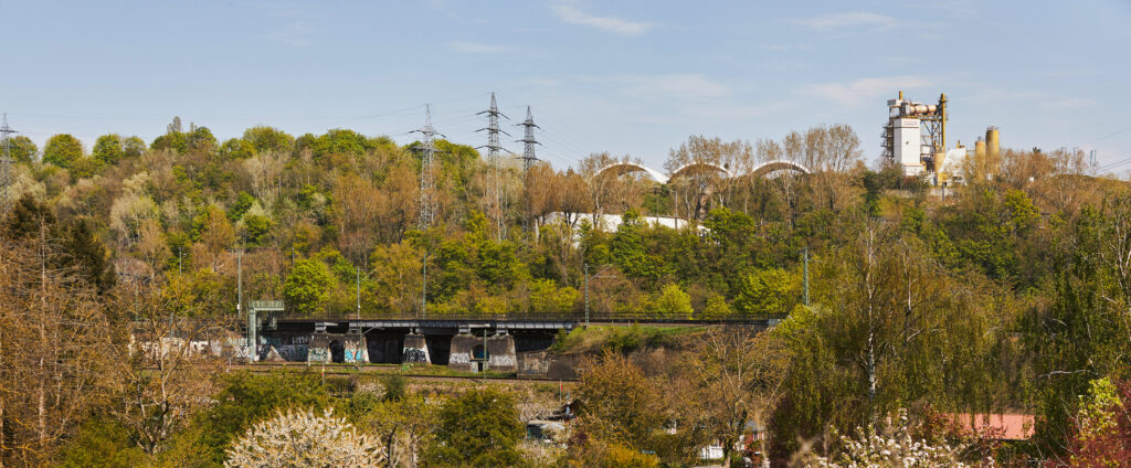 Ich biege rechts ab, mitten hinein ins Gleisdreieck. Drei Bahnunterführungen später gehe ich zwischen intensiv bewirtschafteten Kleingärten einen Hang hinauf. Wo die Kleingärten vor dem nächsten Gleisstrang enden, liegt eine kleine Wiese wie ein Landschaftsbalkon. Von hier aus kann ich das „Tal“ in dem ich gestartet bin, überblicken: Auf der anderen Seite der Gleise und der Autobahn erhebt sich der Deponieberg, der im ehemaligen Steinbruch des Zementwerks errichtet wurde. Dann folgen, im Uhrzeigersinn, der trutzige Backsteinbau einer ehemaligen Brauerei, das Asphaltbrett der Autobahn, die lange und breite Flucht der Gleise und schließlich die Silos, die Dampfwolken und die markanten Stahlbetonskeletttürme des Zementwerks.
