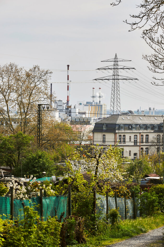 Durch Talheim gelange ich ins etwas höher gelegene Sauerland, eine Siedlung aus den 1990er Jahren mit einem hohen Anteil an gefördertem Wohnungsbau. Oberhalb des trichterförmigen, kleinen Sauerlandparks und vorbei an dem zentralen Schulkomplex mit seinem platzartigen Schulhof, gehe ich mitten hinein in die halboffenen Wohnblöcke mit ihren zahlreichen Durchwegungsmöglichkeiten. Aus dem erkennbaren Bemühen, mit den Notwendigkeiten des verdichteten und kostengünstigen Bauens (Tiefgaragenlüftungsschächte, gemeinsame Zugänge und Außenflächen, Wendeplätze etc.) gestalterisch umzugehen, ist eine Vielzahl an unterschiedlichen räumlichen Situationen entstanden, die aus jedem Block eine Variation des Benachbarten machen und das Durchqueren der Siedlung zu einem kleinen räumlichen und städtebaulichen Parcours. Über eine zum „grünen Finger“ ausgebaute Feuerwehrzufahrt gelange ich an den oberen Rand der Siedlung, wo ein Feldweg die Linie exakt aufnimmt und mich in die Weite der Felder trägt, die von hier zur A66 sanft abfallen. Im Tal erkenne ich die Schiersteiner Brücke mit ihrer Baustelle, den markanten weiß-grünen Silo der Raiffeisen-Genossenschaft am Schiersteiner Hafen und abermals die Türme und Rauchsäulen des Zementwerks. Dahinter, auf der Anhöhe jenseits des Rheins, den Hochhausriegel des ZDF und die Wohntürme von Mainz-Lerchenberg. Auch das entfernte Rauschen der A66 vermittelt Weite.