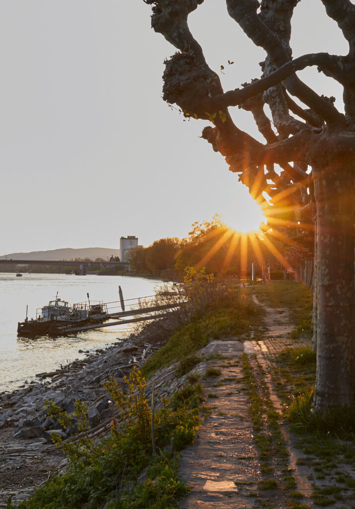 Als die Tamara einläuft, ich mich anstelle und das Schiffchen besteige, fühle ich mich wie ein Held, der bei seiner Heimkehr nach bestandenen Abenteuern auf einer Sänfte durchs Dorf getragen wird. Die Fahrt mit der Tamara entlang der Rettbergsaue und auf das Biebricher Schloss zu, entpuppt sich als der perfekte Abschluss dieses Tages, denn vor mir entfaltet sich noch einmal das ganze Spektrum dieses verrückten Rheinabschnitts mit Schloss und Zementwerk, Kirche und Hochhaus, Promenade und Kiesverladekai, Vogelschutzinsel und Autobahnbücke.