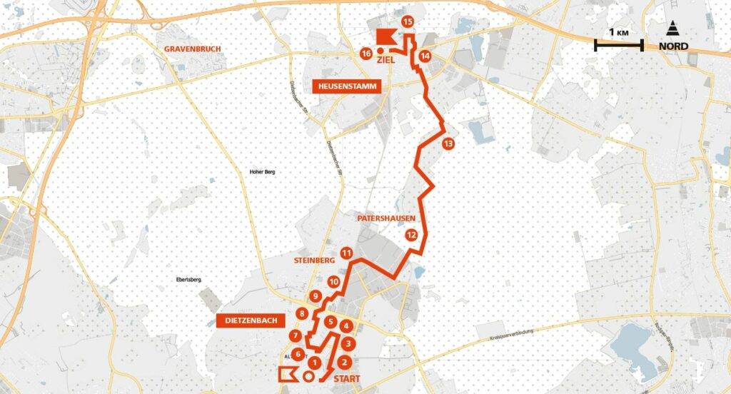 Die S-Bahn-Station Dietzenbach über die Fußgängerbrücke verlassen. Auf der anderen Seite 180-Grad-Wende, dann rechts den Steinkauten[1]weg bis zu Ende gehen.