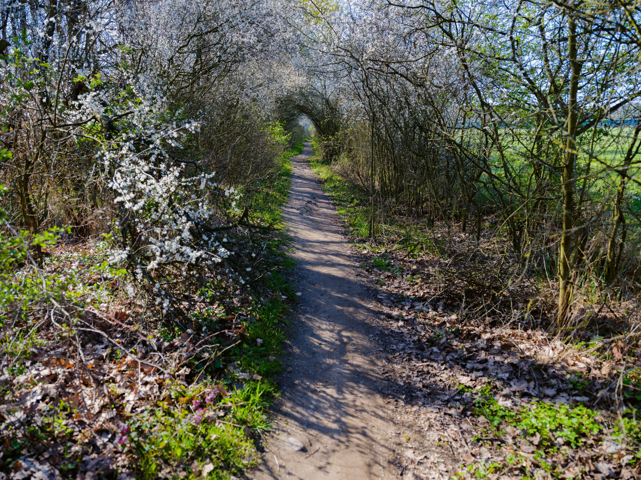 Dem Weg nach links an der Bahn entlang (600 m) und unter der Bahn hindurch folgen.