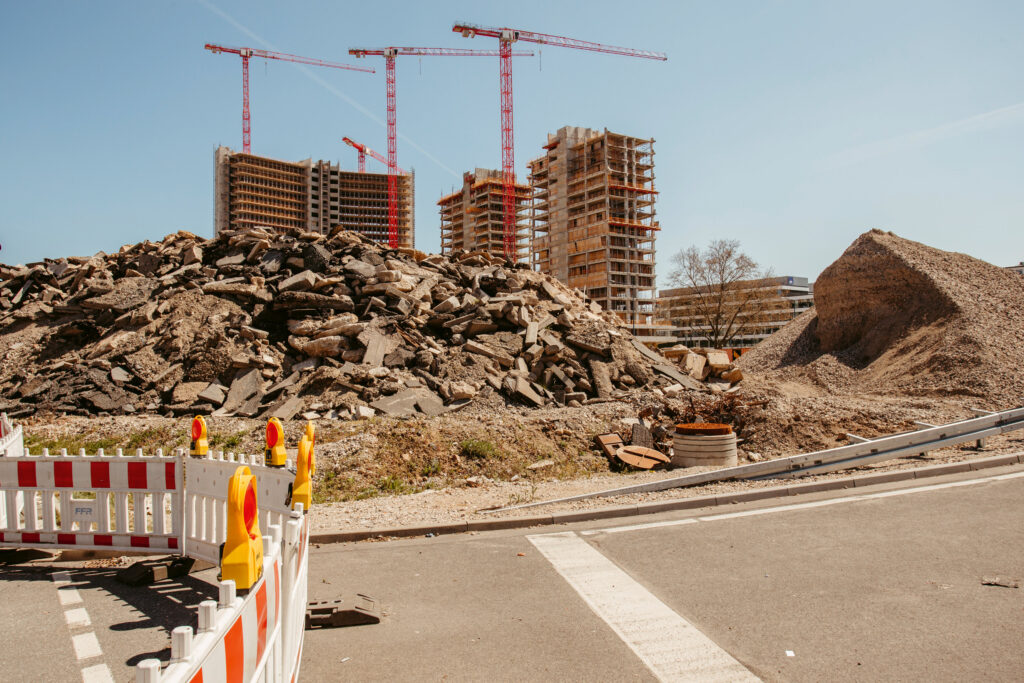 Ich tauche aus der S-Bahn-Station Kaiserlei auf und stehe nach wenigen Metern unter der A661 mit Blick auf die großartige Umbaustelle des ehemaligen Hochhausriegels der Kraftwerksunion. Die 20-Geschosser sind nur noch Skelette, vor ihnen türmen sich die Betonbrocken des abgebrochenenen Dritten im Bunde. Aus der Scheibe an der Berliner Straße wurde ein Stück herausgeschnitten, damit die Wohnen-auf-Zeit Appartments, die anstelle der Großraumbüros entstehen sollen, besser zu belichten sind. Der Immobilienmulti Consus hat sich auf „Problemimmobilien“ spezialisiert, häufig Bürohochhäuser aus den 70er Jahren, die er zu Luxusappartments umbaut.