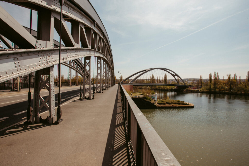 Überqueren und geradeaus bis zur Brücke und über den Main gehen. Dann rechts in den Offenbacher Hafen und auf der Hafenpromenade und am Mainufer entlang bis zur Staustufe Offenbach. Den Main überqueren, dann rechts die Franziusstraße entlang.