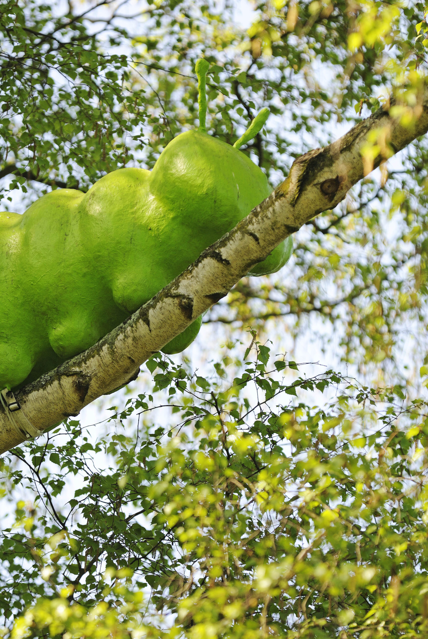 Die dicke Raupe gehört zu einer ganzen Serie von Baumobjekten, die der Frankfurter Karikaturist F. K. Waechter für den GrünGürtel entworfen hat. Seine Zeichnungen wurden der Stadt Frankfurt geschenkt und seit 2005 nach und nach entlang des Rundwanderwegs umgesetzt. Die Raupe wurde 2008 nach einer Skizze Waechters vom Künstler Andreas Rohrbach aus Kunststoff gefertigt und zunächst im Erlenbruch installiert.