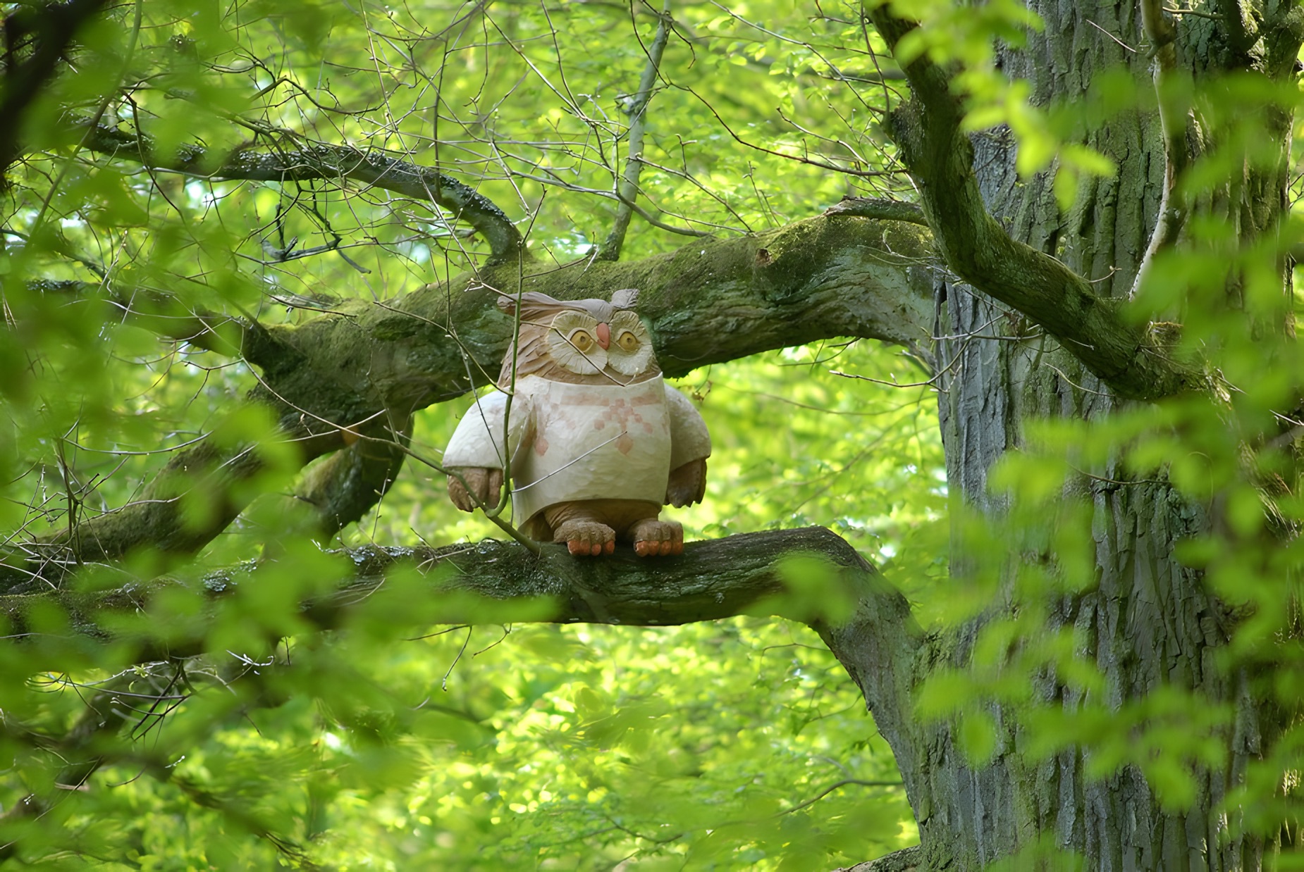 Die Eule im Norwegerpullover von F.K. Waechter ist eines der bekanntesten Kunstwerke im Frankfurter GrünGürtel. Hoch oben in einer Eiche am Jacobiweiher im Stadtwald wacht sie über Spaziergängerinnen und Spaziergänger und verbindet auf humorvolle Weise Naturerlebnis und Komische Kunst.
