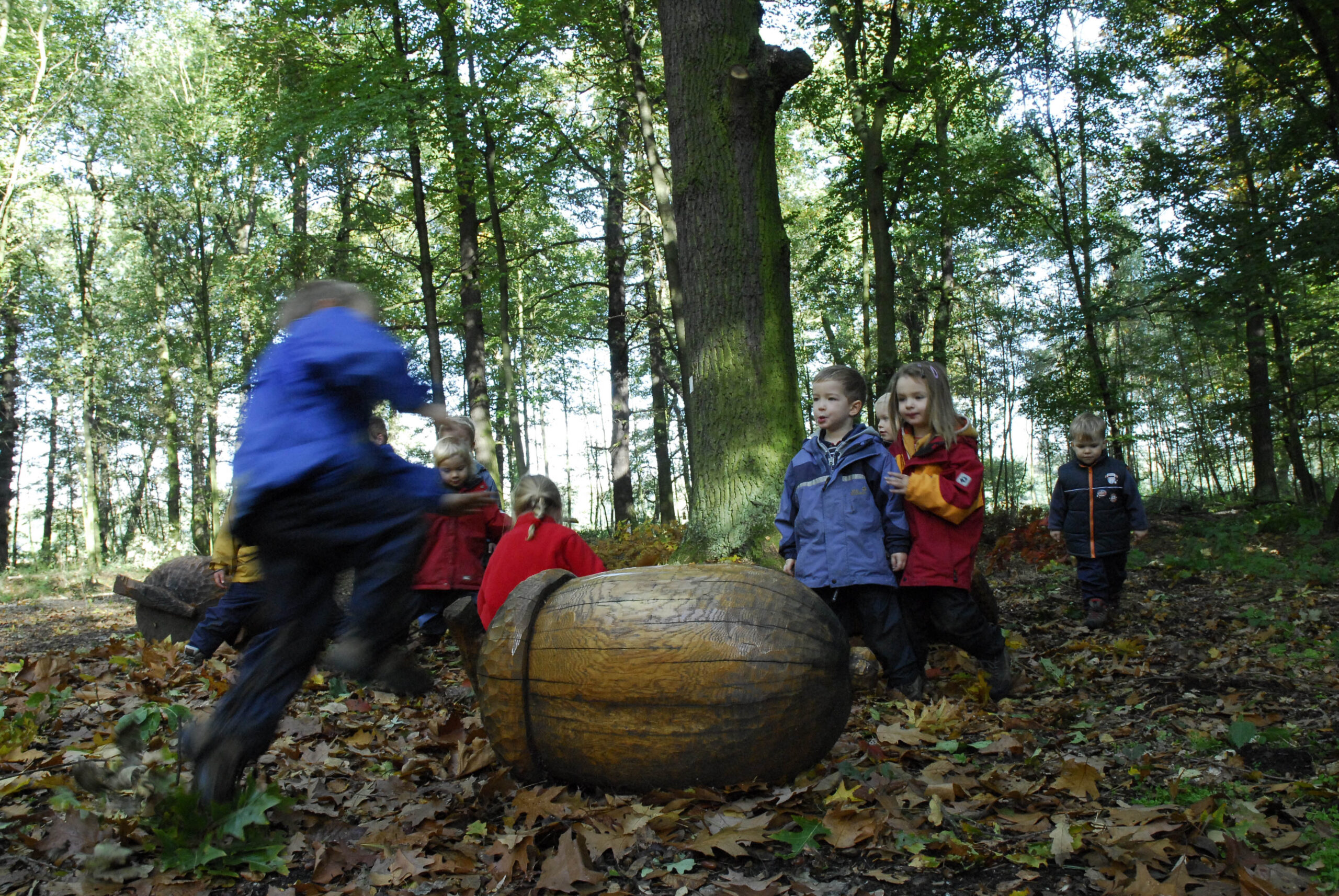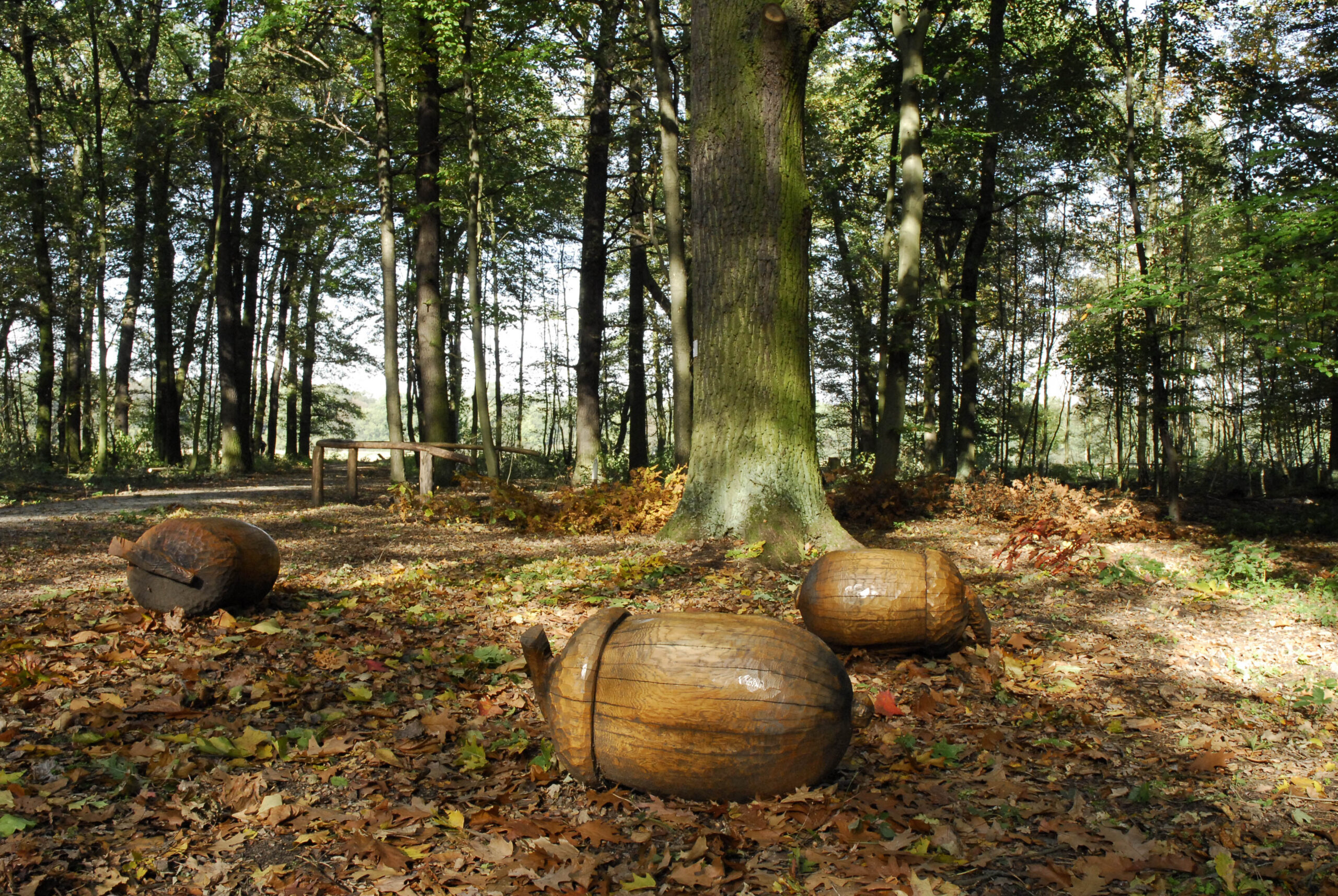 Die Monsterkinder von F. K. Waechter sind Teil der Komischen Kunst im Frankfurter GrünGürtel und liegen unter einer alten Eiche im Schwanheimer Wald. Überdimensionale Eicheln aus Holz machen den Baum zu einem besonderen Blickfang.