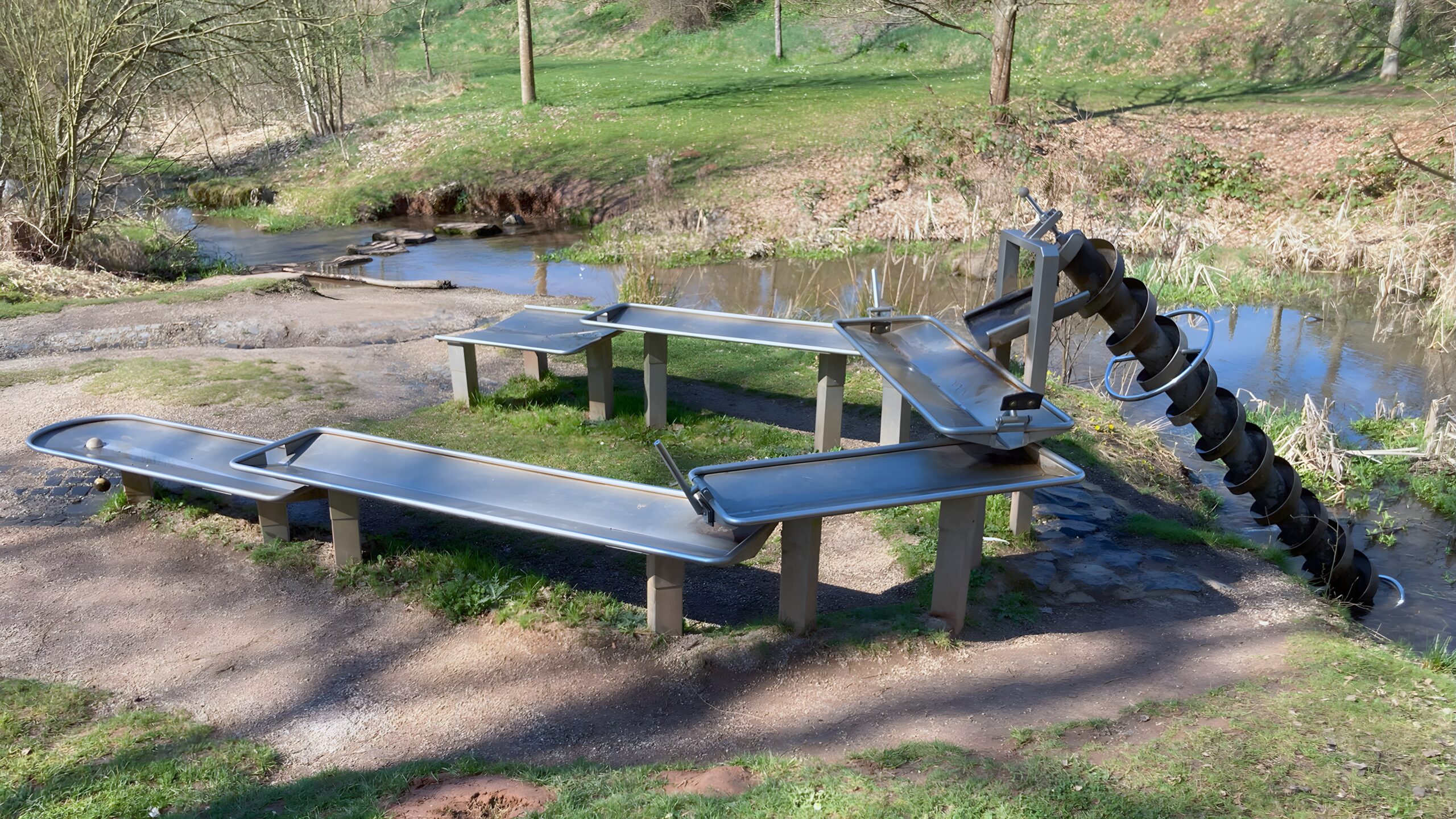 Ein besonderes Element ist die Archimedische Schraube, mit der Wasser angehoben und umgeleitet werden kann. Sie veranschaulicht ein historisches technisches Prinzip und lädt zum Ausprobieren ein. So verbindet der Wasserspielplatz spielerische Bewegung mit anschaulicher Umweltbildung und macht die Bedeutung eines lebendigen Gewässers für Natur und Menschen erfahrbar.